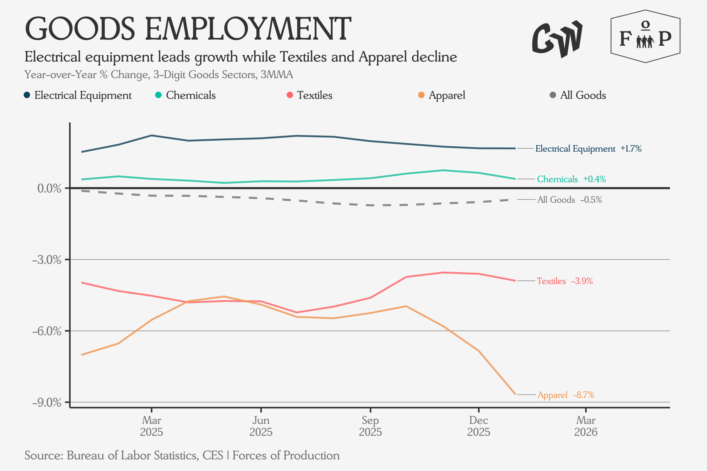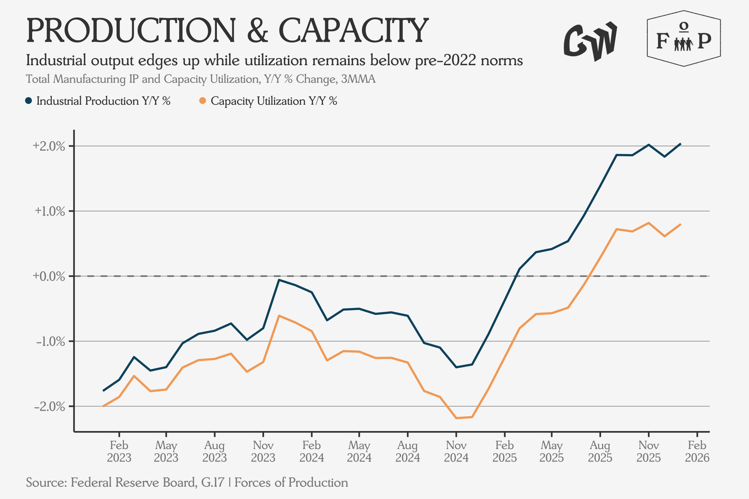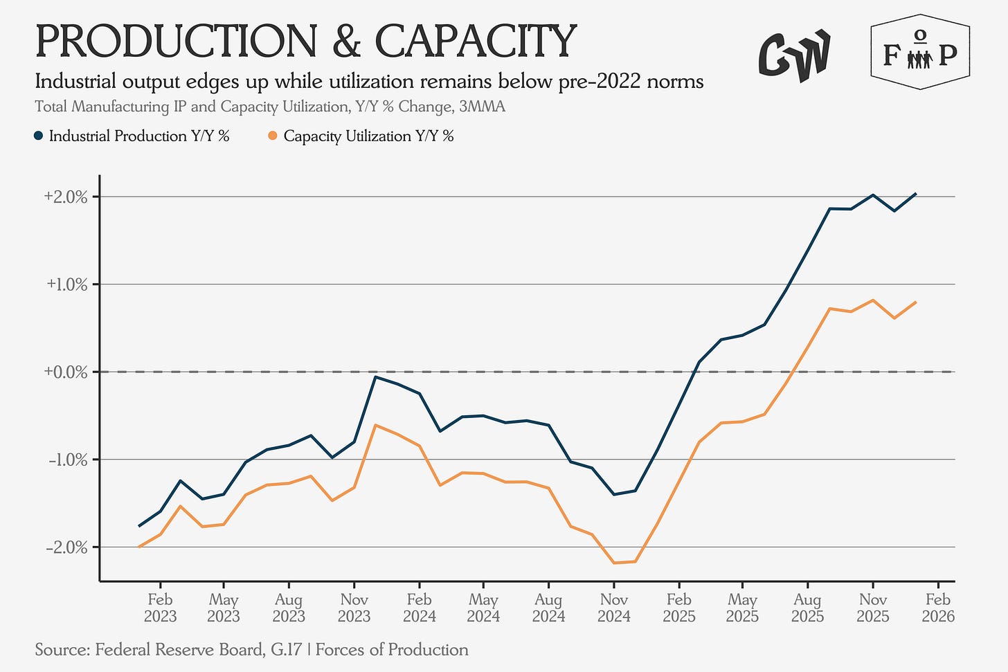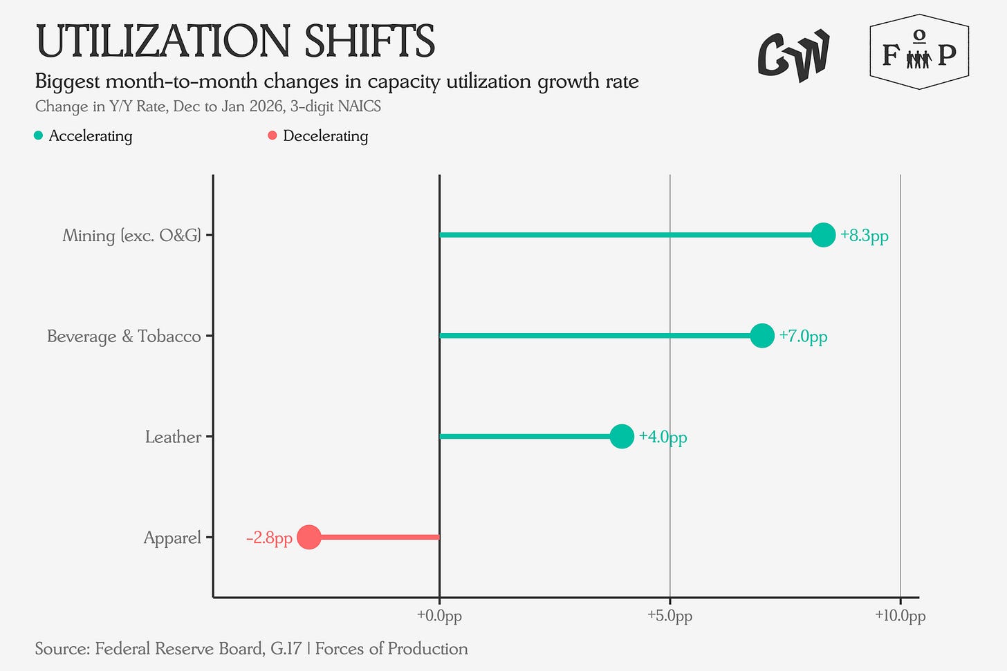 Capacity utilization shifts were mostly positive: mining ex oil and gas accelerated by 8.3 percentage points, beverages and tobacco by 7.0. Apparel was the notable decline, losing 2.8 percentage points of output year-over-year.