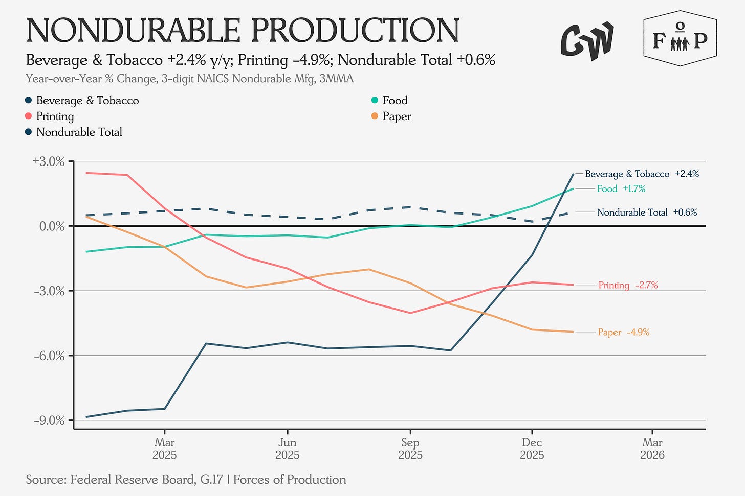 Nondurables tell a bleaker version of the same story. The aggregate is barely positive at +0.6 percent. Paper is down 4.9 percent, printing down 2.7 percent. Only beverage and tobacco (+2.4%) and food (+1.7%) managed to stay above the zero line. The production recovery, such as it is, belongs entirely to durables.