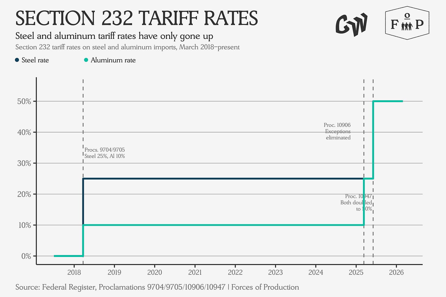 Yet there is one group of tariffs that survived the Supreme Court’s ruling, which have in fact been in force since the first Trump administration: the Section 232 tariffs on steel and aluminum. These tariffs were put in place nearly eight years ago, and the rates have only gone up since then — from 25 percent on steel and 10 percent on aluminum in March 2018, to 25 percent on both when country exceptions were eliminated last March, to 50 percent on both when the rate doubled in June.