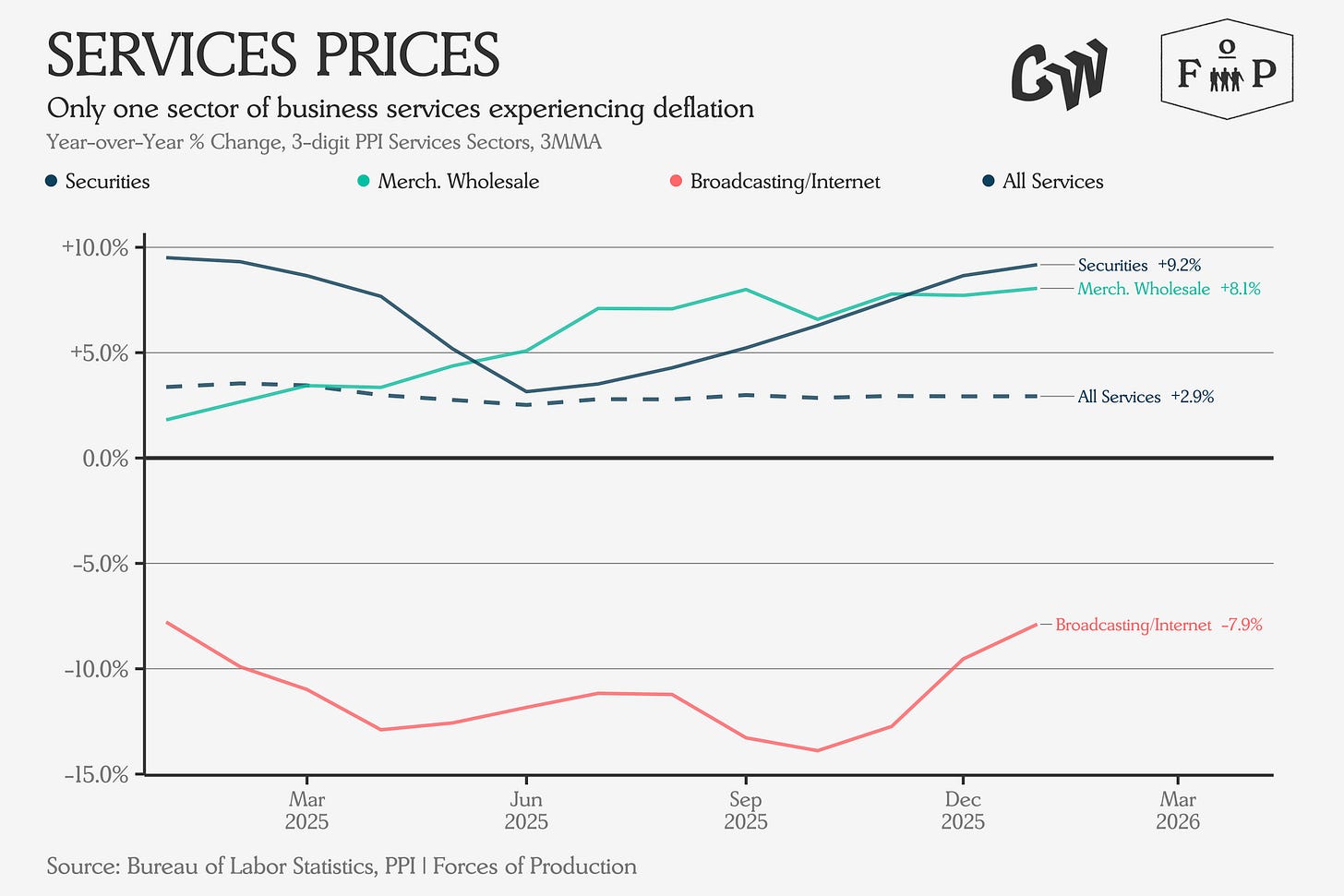 Producer prices show two things worth watching. Ranking 3-digit sectors by year-over-year PPI change, the services side is led by securities at +9.2 percent and merchandise wholesale at +8.1 percent. The aggregate for all services sits at +2.9%. At the bottom, broadcasting and internet continue its deflationary streak at -7.9 percent.