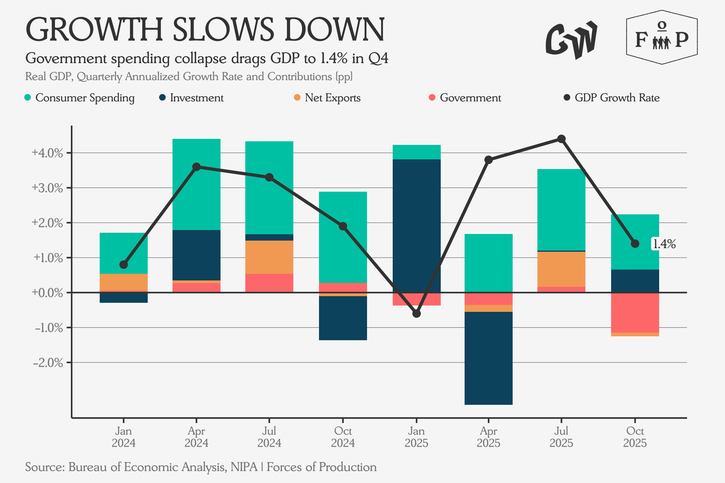 Headline GDP growth fell to 1.4 percent annualized in Q4, down sharply from 4.4 percent in Q3. The single largest drag was the federal government, which subtracted 1.15 percentage points from growth as the shutdown drove a 16.6 percent annualized plunge in federal government consumption and investment for the quarter. Absent the shutdown, growth would land around 2.5 percent — not spectacular, not weak, but a step down from stronger mid-year growth.
