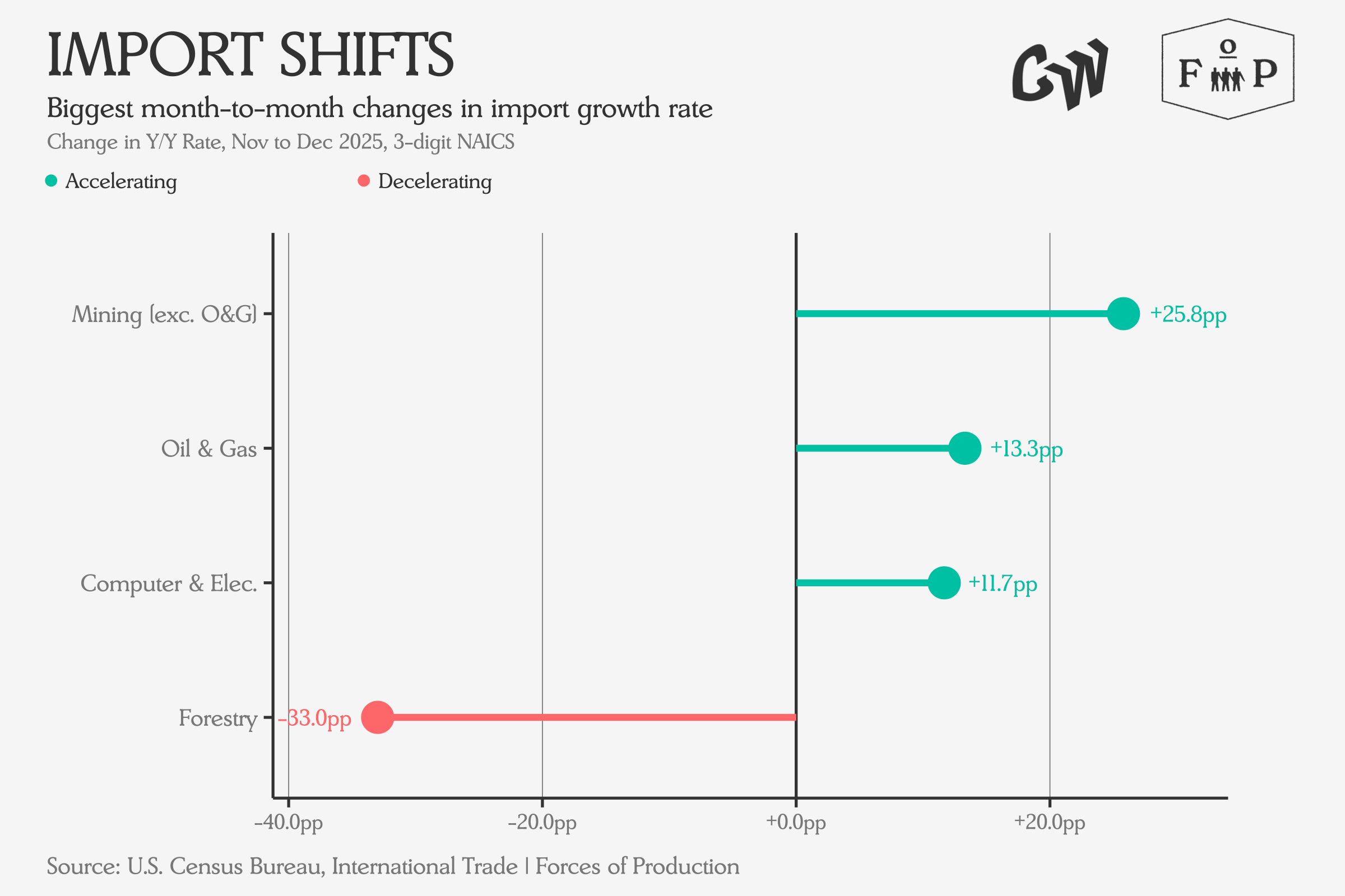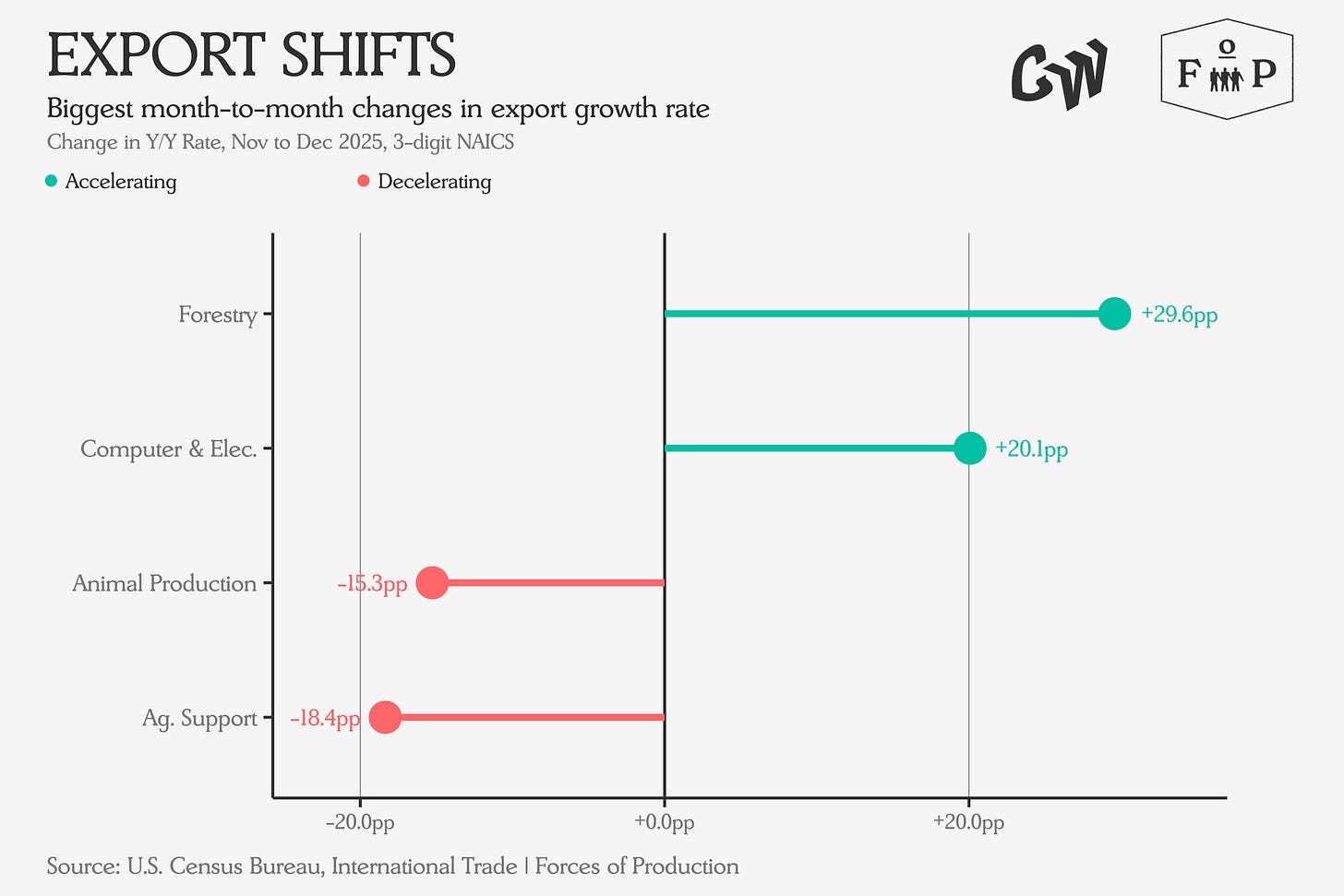 Exports show a mirror pattern for some of these: forestry exports surged (+29.6pp) against falling imports while computer and electronics exports accelerated (+20.1pp) on rising imports.