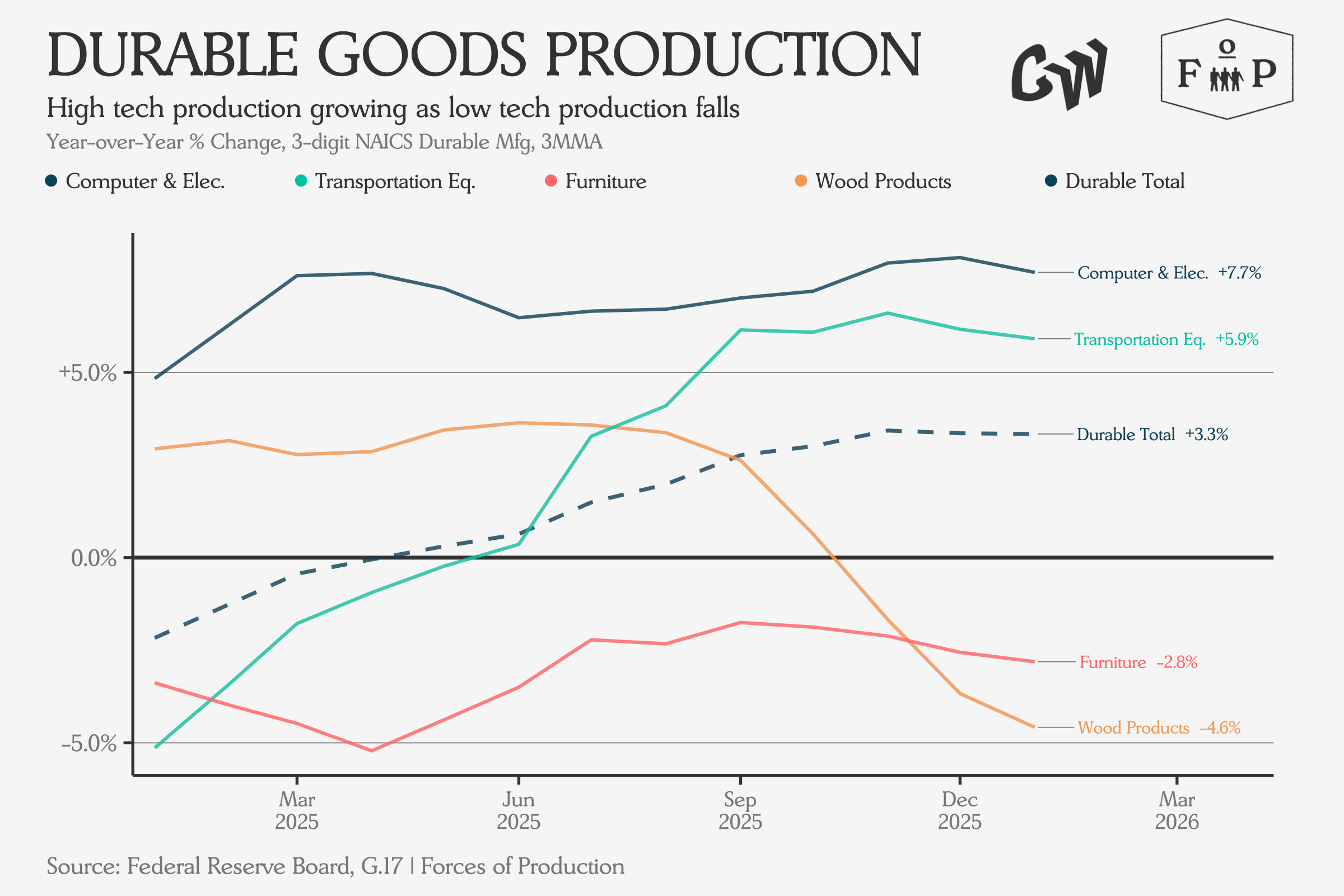 The charts below rank every 3-digit manufacturing sector by year-over-year output change and pull out the top and bottom two. Among durables, the winners are the high-tech, heavy-duty end: computers and electronics up 7.7 percent transportation equipment up 5.9 percent. The losers are the lower-tech end: wood products down 4.6 percent, furniture down 2.8 percent.