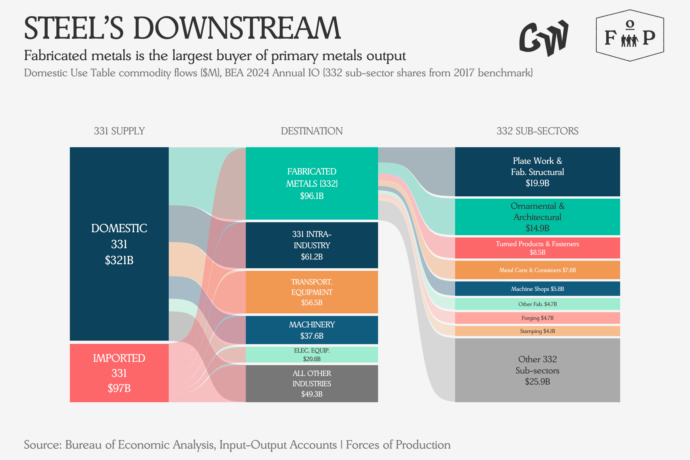 The Section 232 tariffs cover commodities primarily sold by the Primary Metals Production industry — NAICS 331, which includes iron and steel mills, aluminum smelting, and related subsectors. Who buys from 331? The single largest downstream customer is fabricated metals, NAICS 332: the 49,000 firms that turn steel plate, aluminum sheet, and metal bar stock into structural beams, pipe fittings, springs, machine parts, and hardware. Here is that flow as a Sankey diagram, roughly sized by dollar volume.