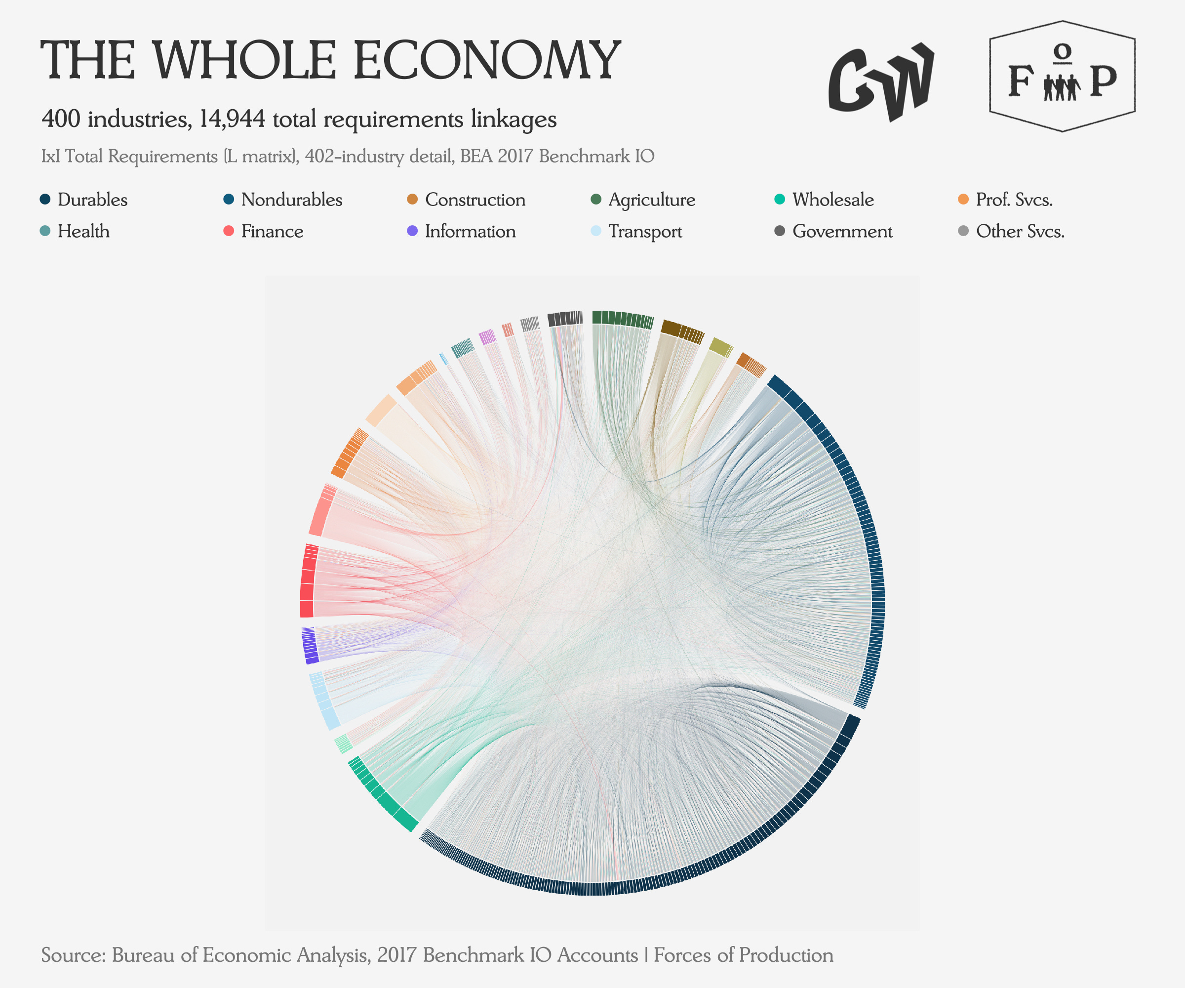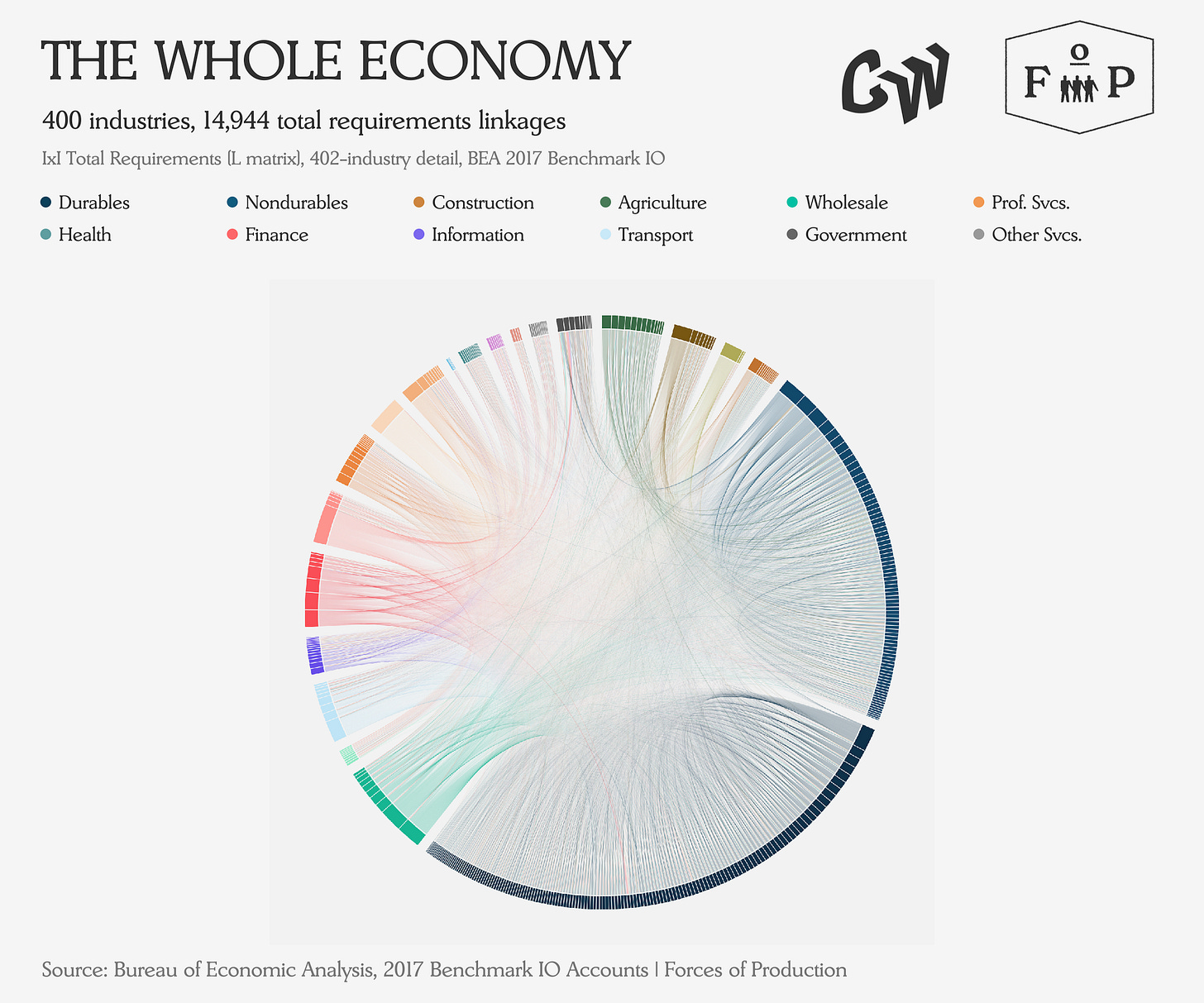 The IO tables are one of the less well-known products of the national accounts. The Bureau of Economic Analysis (BEA) produces detailed benchmarks every five years — most recently for 2017 — whichcover the linkages between 402 individual industries, mapping how many dollars flow from one industry (the seller) to another (the buyer). The diagram below shows this whole system: every arc represents a transaction between two sectors.