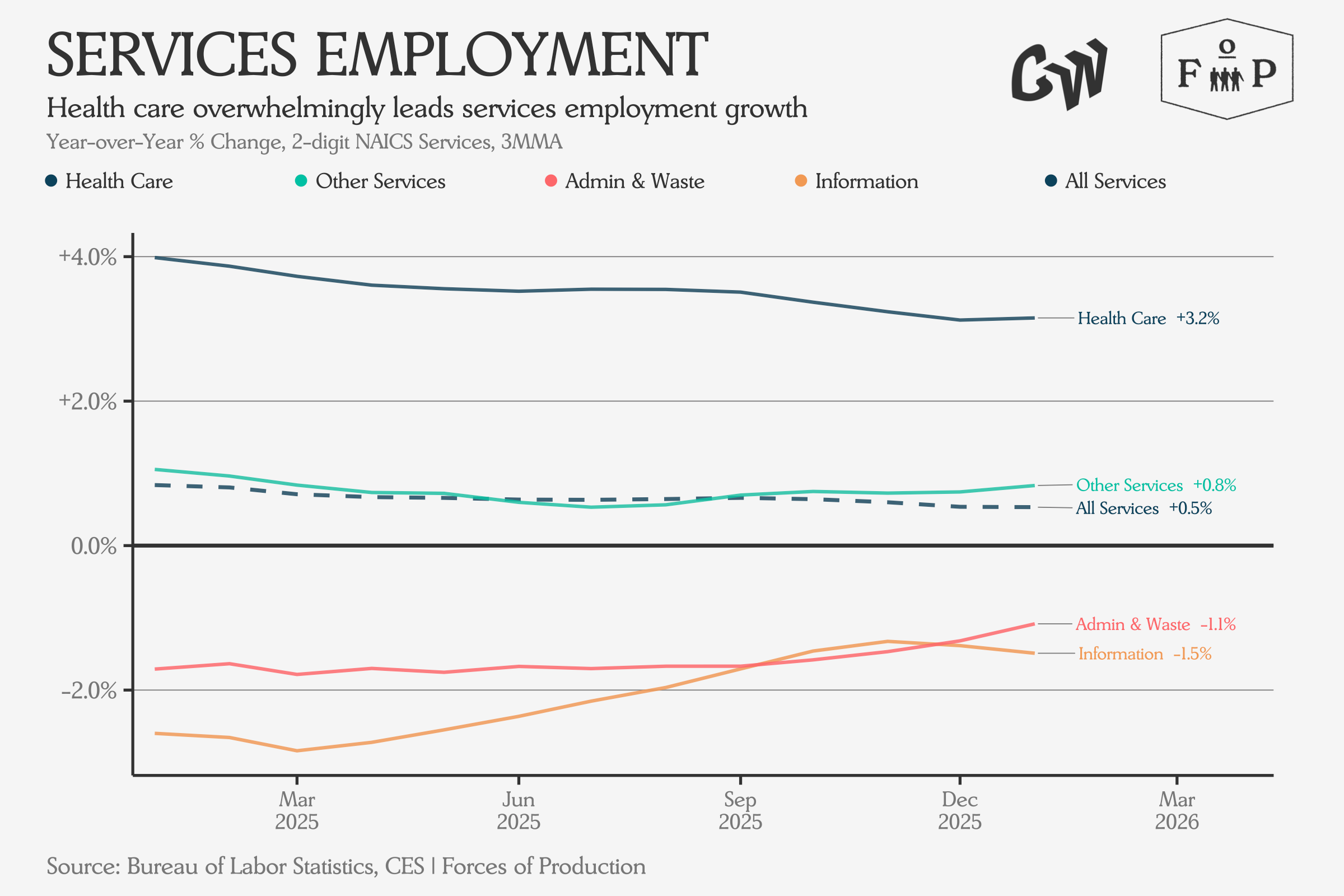 On the goods side, manufacturing employment is essentially flat year-over-year, with construction leading at +1.2 percent. Mining and logging continue to contract.