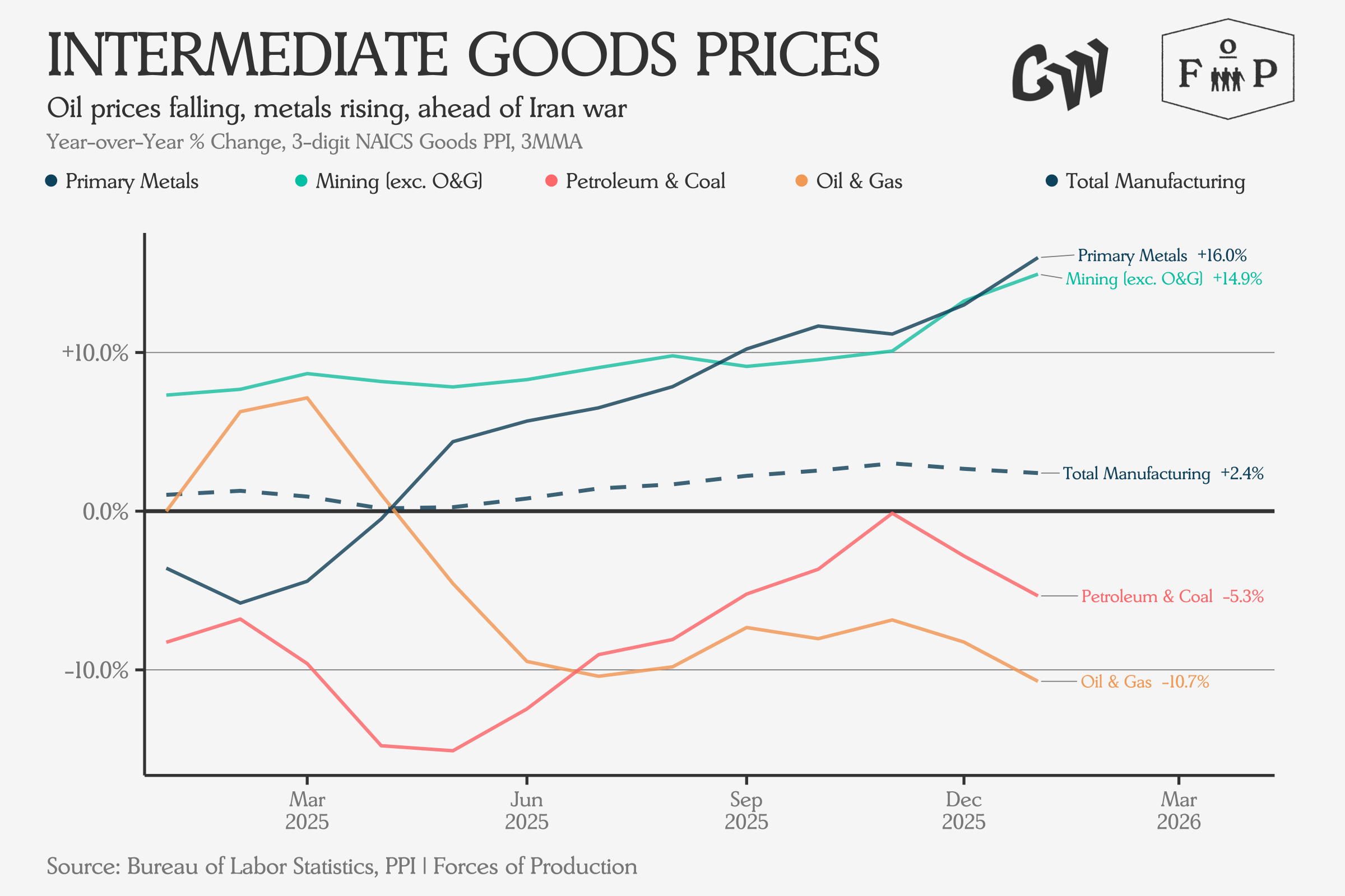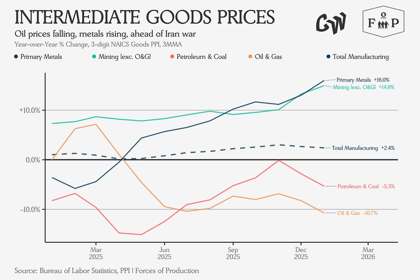 The same ranking on the goods side puts primary metals at the top: PPI up 16 percent year-over-year — directly relevant to the tariff analysis above, and consistent with what we would expect from anow markedly higher 50 percent Section 232 rate. Mining excluding oil and gas is close behind at +14.9 percent. At the bottom, oil and gas extraction prices are down 10.7 percent, with petroleum and coal products down 5.3 percent. Total manufacturing PPI sits at +2.4 percent.