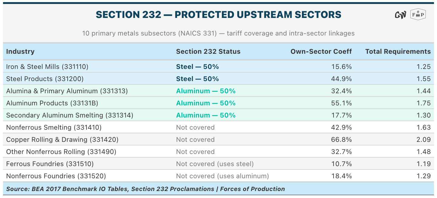 Five of these ten subsectors are directly covered by Section 232: iron and steel mills, iron and steel forging, steel wire drawing, aluminum production, and aluminum foundries are all covered at the full 50 percent rate. The remaining five — copper, nonferrous foundries, other rolling and drawing — are not covered, but do purchase from the covered subsectors, so they still likely face some amount of tariff indirectly through higher input costs. The “own-sector coefficient” column shows how tightly linked these industries are to each other: copper rolling and drawing sources 67 percent of its output value from within primary metals, though nearly all of that is untariffed copper.