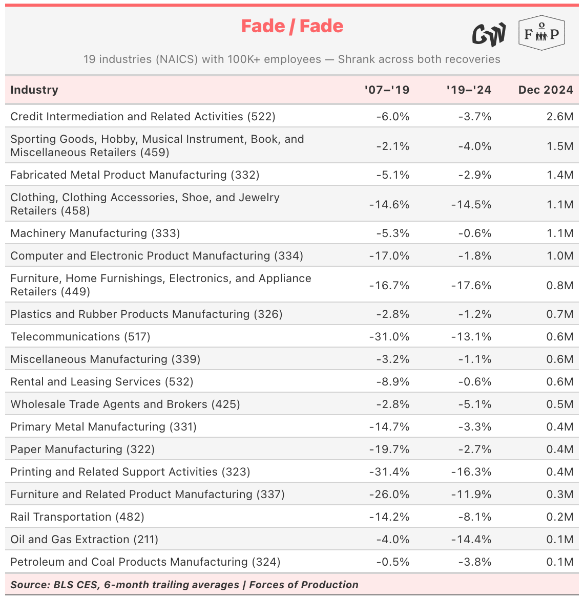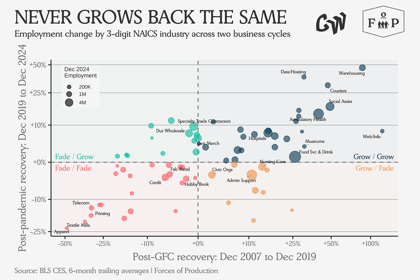 Over both swings through the macro business cycle, we saw the total employment level grow, but that growth favored different sectors.Some parts of the supply side have returned stronger than before, while others have steadily weakened over the last twenty years.