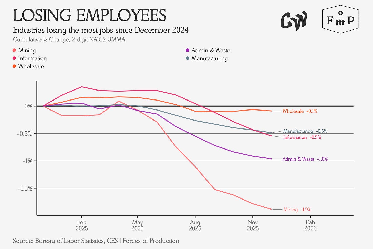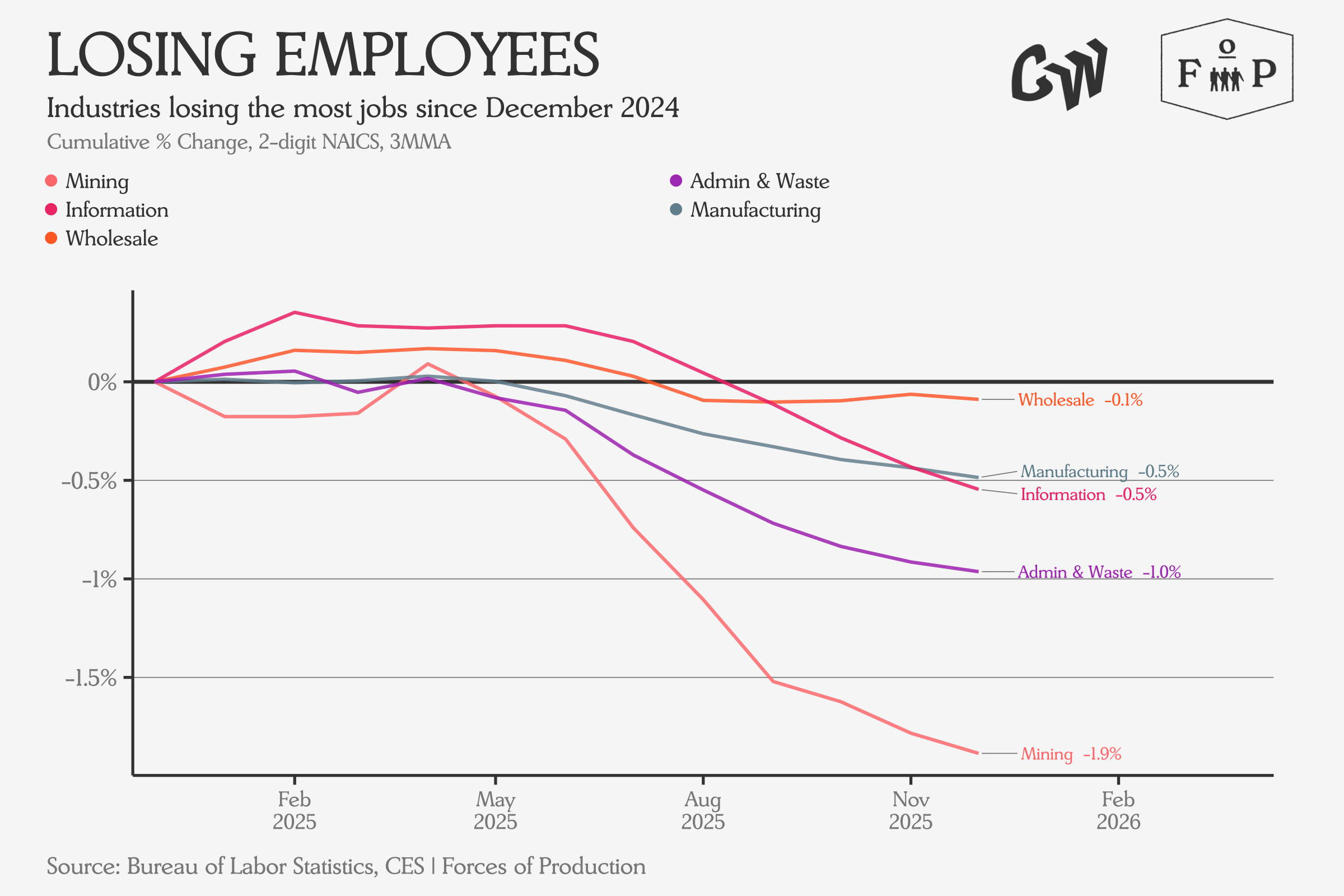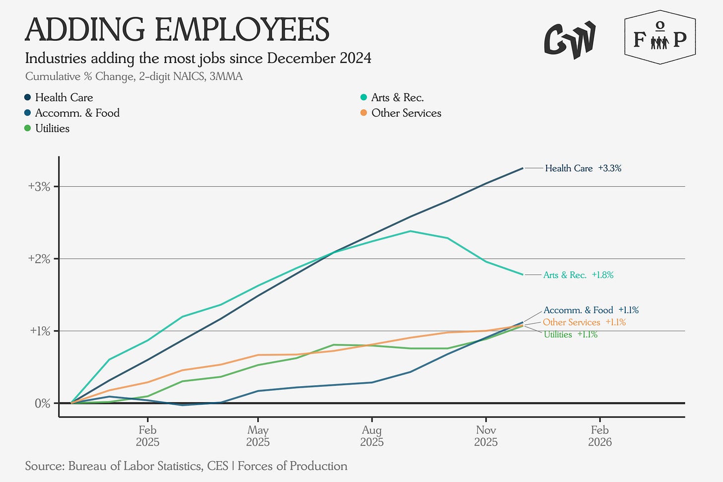 The biggest gains have all been in the service sector, with Health Care the clear standout at 3.1% employment growth since December 2024.
