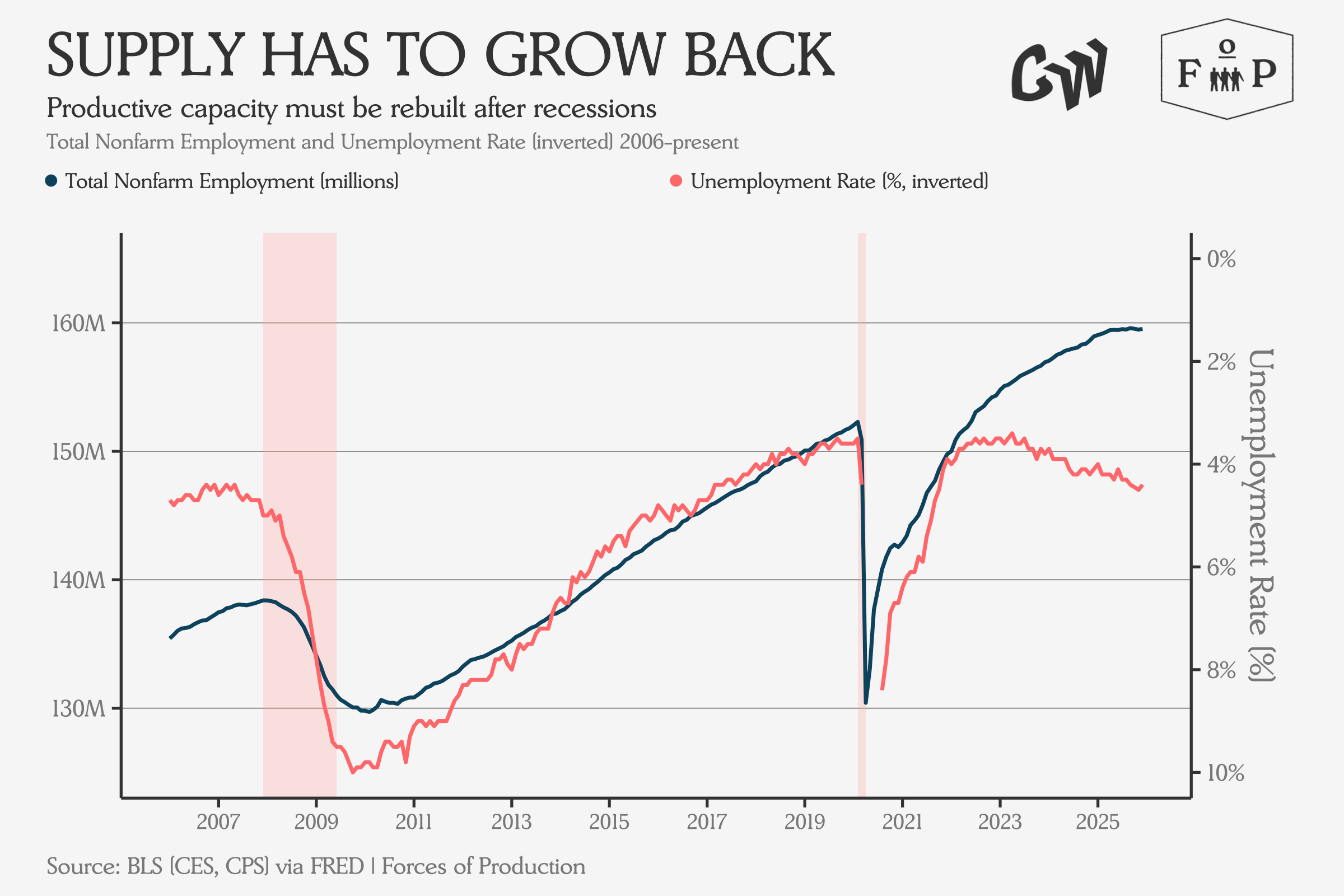 Employment is tricky, though, because it is so tied to the business cycle. In times of crisis, the supply side loses jobs across goods and services alike, and those lost jobs have to be rebuilt from scratch. This is what makes recessions so damaging for the supply side: existing capacity disappears, and new capacity has to be constructed from the ground up.