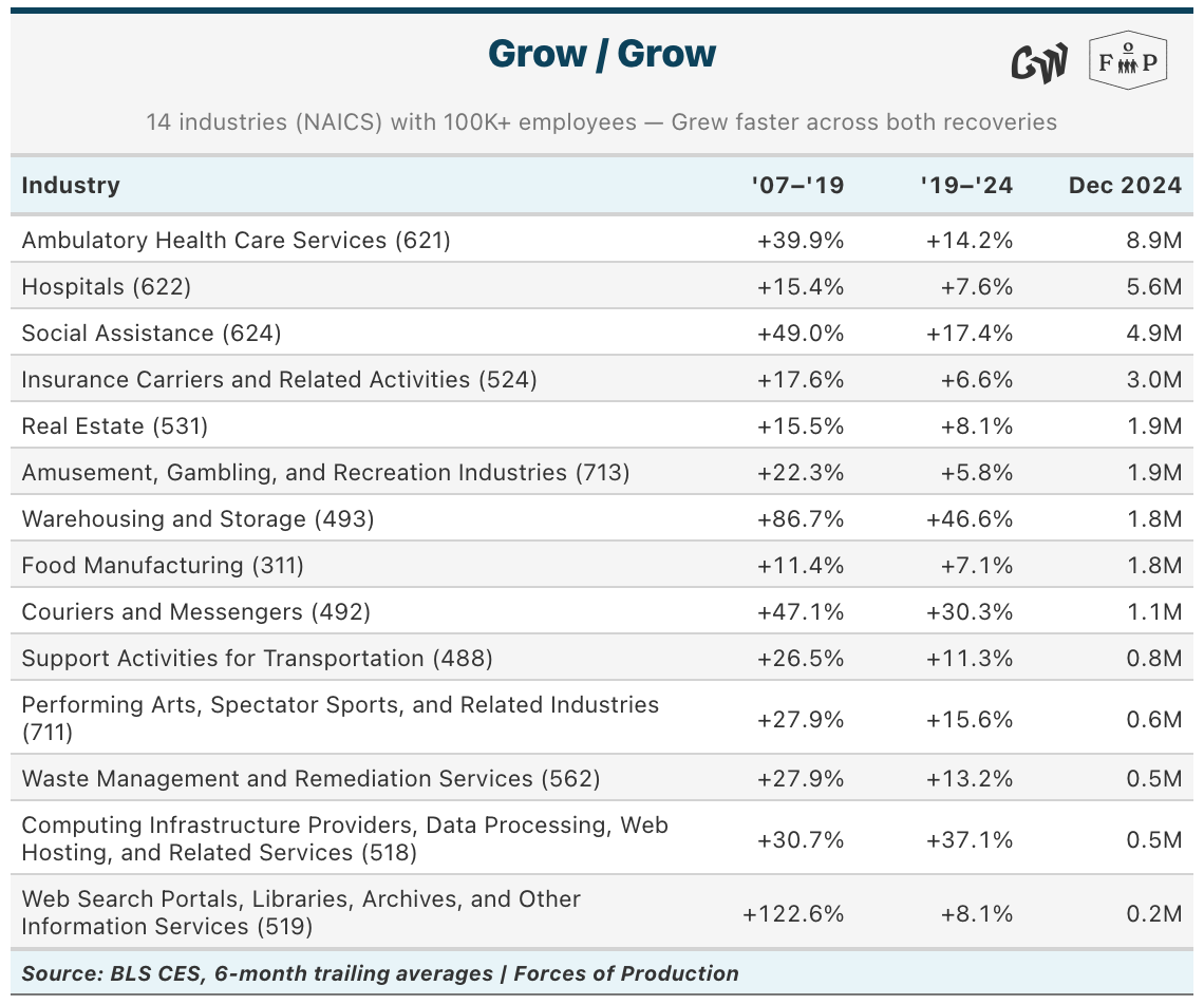 Most of these industries in which employment levels grew back stronger over both crises are in the service sector, with a split between high-wage/high-margin work like Professional Services, Insurance, and Data Hosting and low-wage/low-margin work like Social Assistance, Warehousing, and Food Manufacturing.