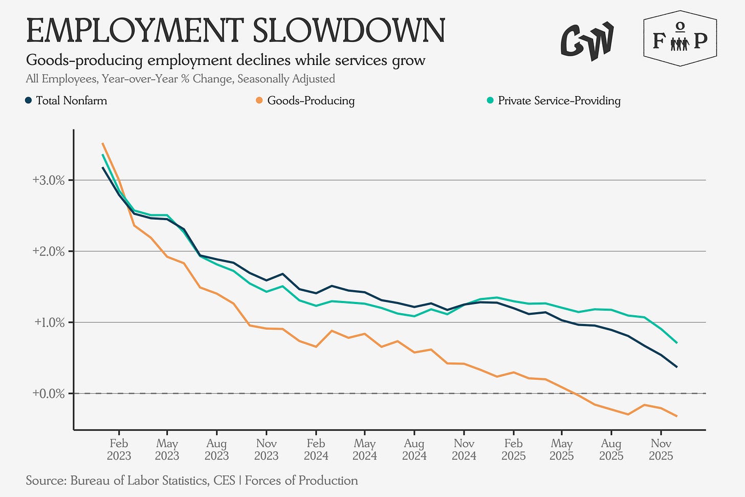 The shift towards services, and the changing composition of those services, is the biggest story of the 21st century for the US economy. But one of the major limitations in analyzing the supply side is the lack of output data for the service sector. Goods are more closely tracked than services in the economic data, with multiple measures of price and output. For services, data on the price of services sold to other businesses is published, but no measures of output. There is one indicator that provides data on both goods and services though: employment. Given that labor is the original force of production, employment is a great example to work from.