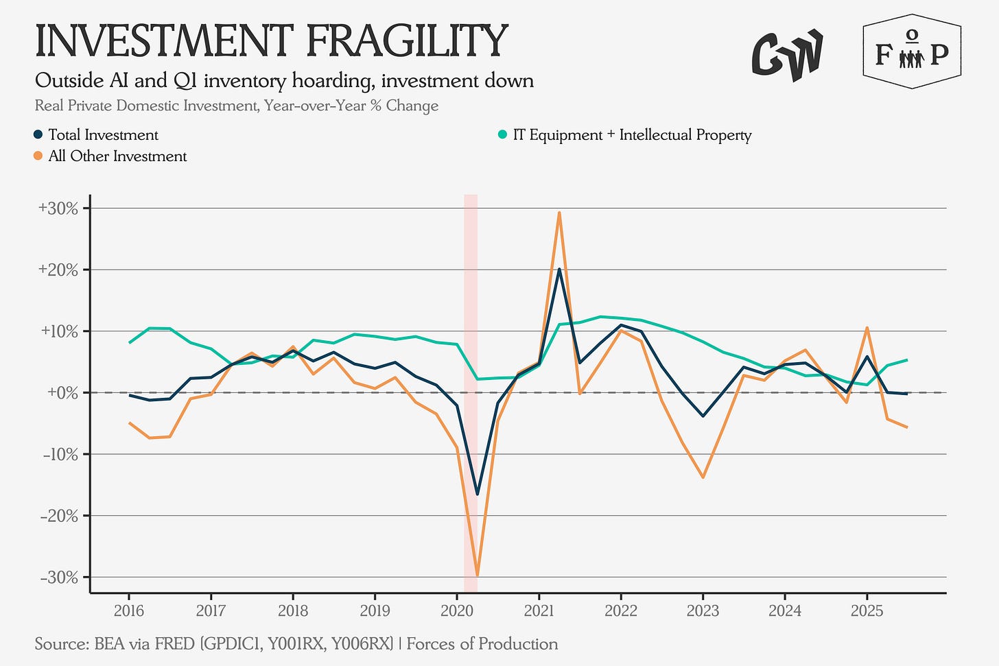 Despite this, the uncertainty created by a more volatile global geopolitical situation and nonsensical domestic economic policy does seem to be having an effect on investment, at least outside of AI. Manufacturers have been saying as much in Federal Reserve surveys all year.