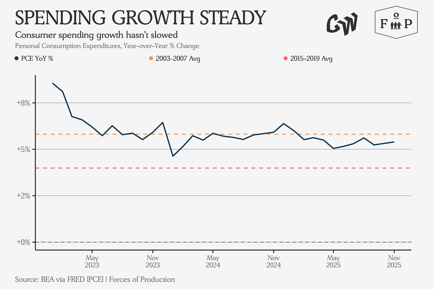 If anything, what’s happening seems like a very old business cycle dynamic. Back in the days of Keynes and Jevons, the market economy was much smaller and cycles were driven more by investment than consumption. Early macroeconomists noticed this and identified a pattern where a slowdown in investment spending would lead to a slowdown in hiring, and in output growth. This could become self-reinforcing, because the decision to invest less was validated by the lower consumer demand from lower hiring. Since today’s economy is much more insulated by consumption spending, which remains high, this dynamic can still produce a slowdown, but it will likely be muted, protracted, and mild on its own.