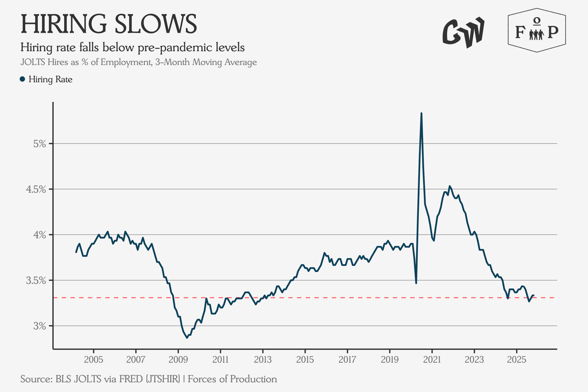 There is also evidence that this slowdown is feeding through to employment, with a lower hiring rate than any point in over a decade in 2025.